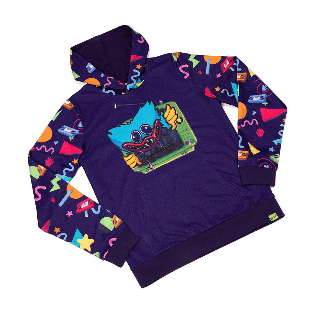- ALL-OVER-PRINT: Features a special all-over-print that showcases vibrant artwork across different areas of the hoodie! A retro pattern decorates the sleeves and hood, while an extra-large chest print depicts Huggy Wuggy popping out of the TV to play with you!